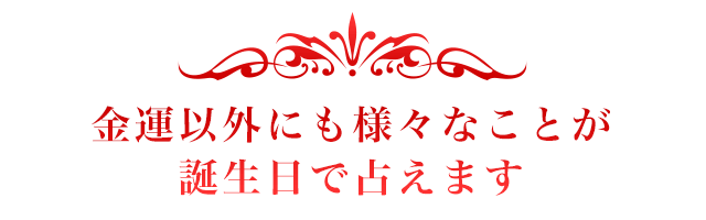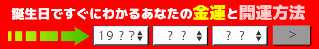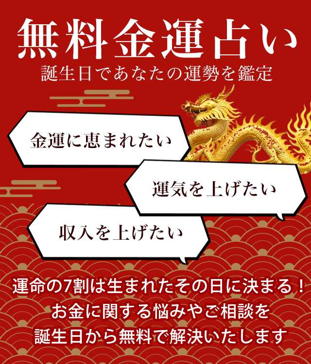 金運占いは、その人の生まれた年・月・日から基本性格や運命を導き出し、金運を最高に高める占いです。これから先の人生で重要な金運引き寄せ法を明らかにしていきます。特に今年はあなたの行動次第で金運も大きく変化します。誕生日にはあなたの運気の流れをよくするためのヒントがたくさん詰まっています。さっそく誕生日を入力して無料鑑定してみませんか?